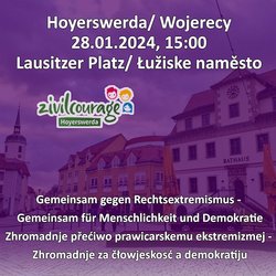 BÜNDNIS 90/DIE GRÜNEN ruft zur Teilnahme an der Demonstration "Gemeinsam gegen Rechtsextremismus - Gemeinsam für Menschlichkeit und Demokratie “Gemeinsam gegen Rechtsextremismus – Gemeinsam für Menschlichkeit und Demokratie - Zhromadnje přećiwo prawicarskemu ekstremizmej – Zhromadnje za čłowjeskosć a demokratiju” am Sonntag, dem 28. Januar 2024, um 15.00 Uhr auf dem Lausitzer Platz in Hoyerswerda.