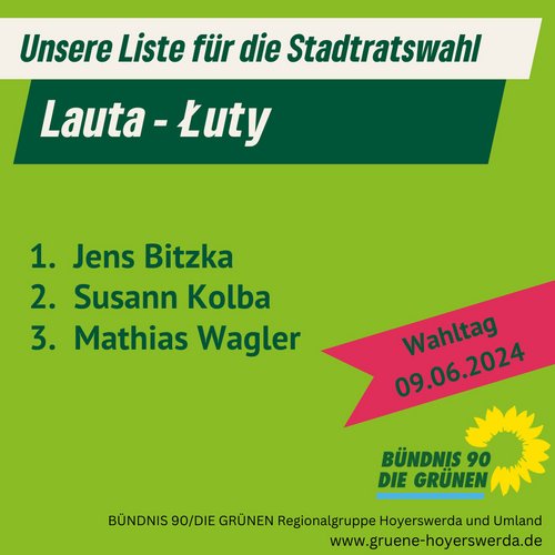 Zur Stadtratswahl in Lauta am 9. Juni 2024 tritt BÜNDNIS 90/DIE GRÜNEN mit folgender Stadtratsliste an: