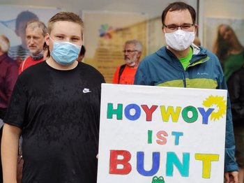 Um 14:59 Uhr und 50 Sekunden leitete Lausitz-Center Manager Henke lautstark einen Countdown ein. Im Anschluss daran war der gelbe Infostand abgebaut. Hoywoy bleibt bunt stand auf einem Transparent. Und so ist es auch! Vielen Dank an alle 120 Teilnehmer*innen.